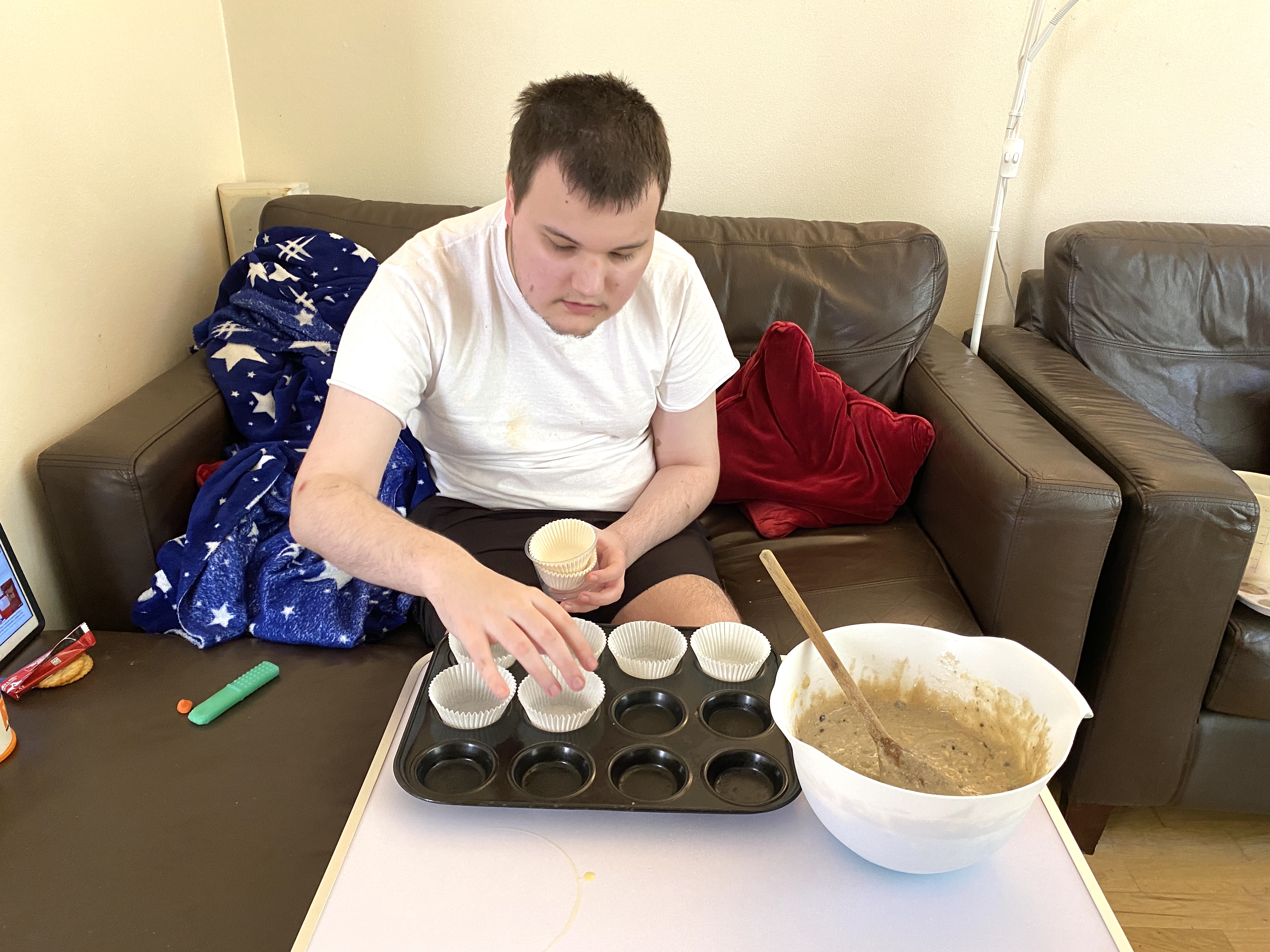 James carefully put the muffin cases in the muffin tin, and then we could spoon out the mixture, filling each muffin case about 3/4 full. This was tricky work but James did well with some help.