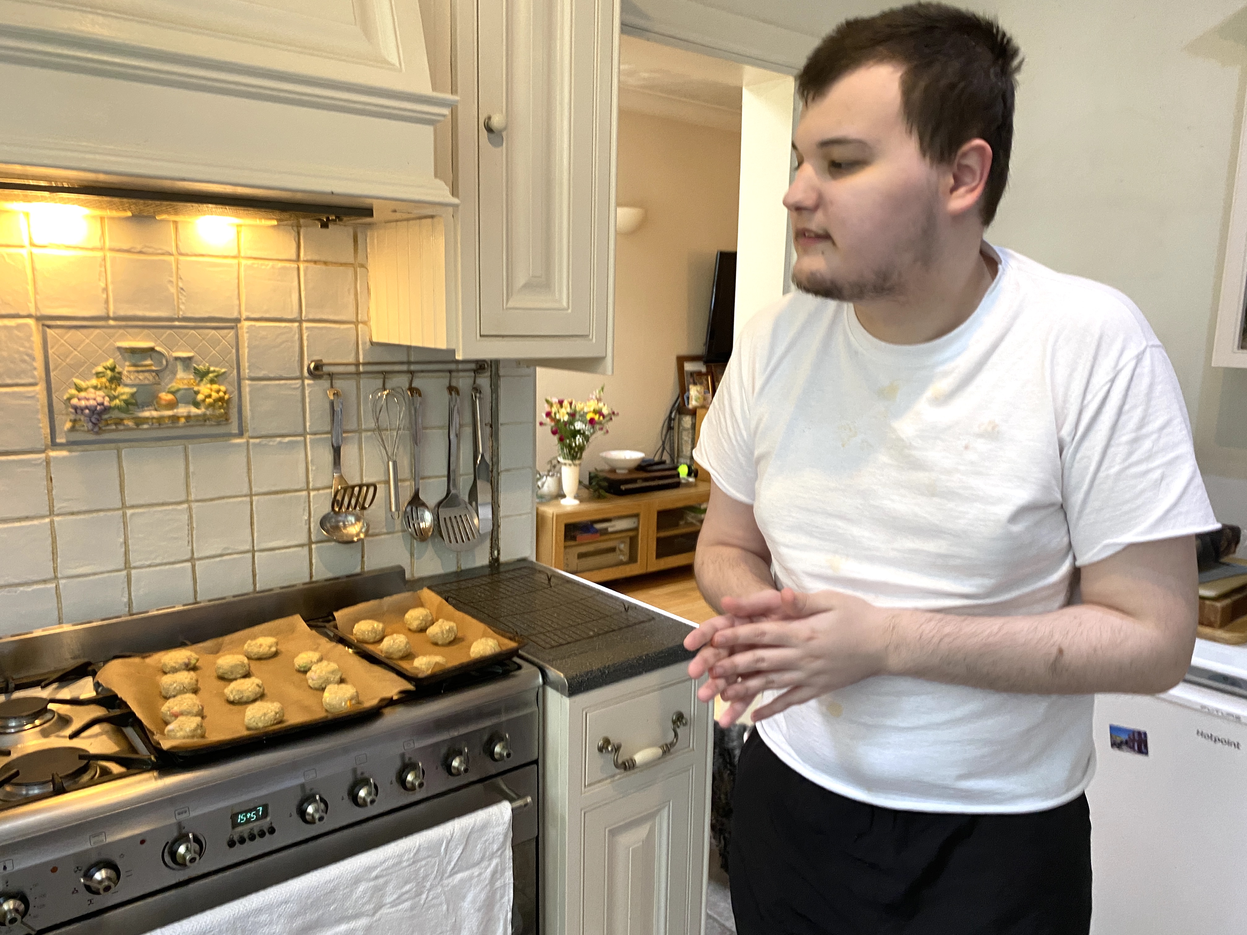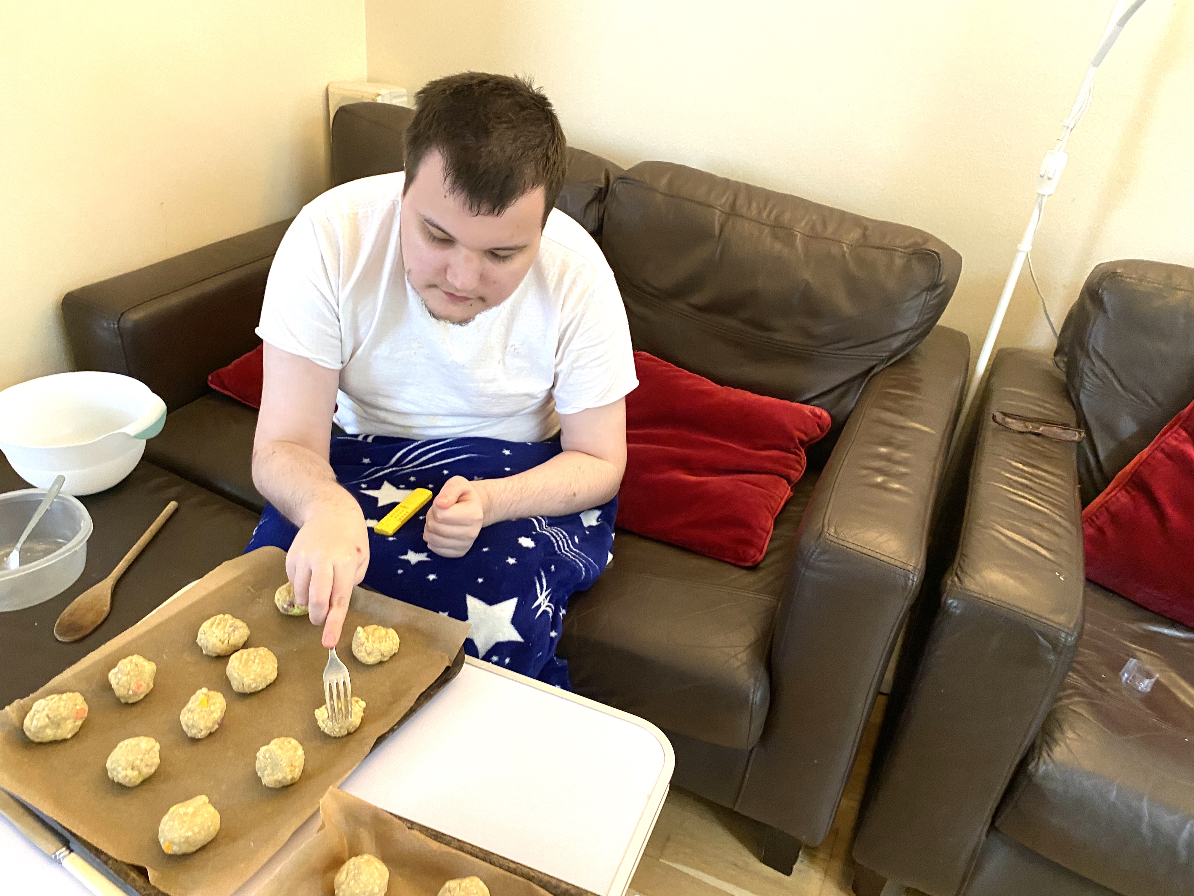 James stirred all of the ingredients together, but then had to wait for 20 minutes while the cookie dough chilled in the fridge. Just as well there was the wooden mixing spoon to lick clean!
