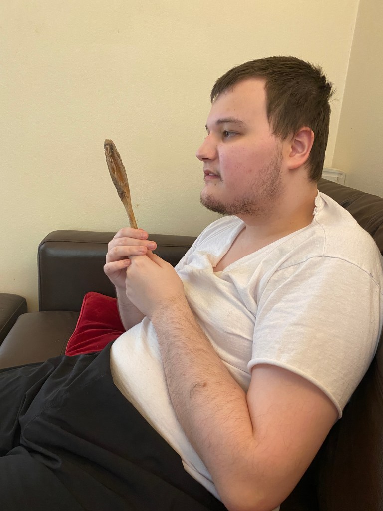James stirred all of the ingredients together, which made a very sticky cake batter that started to get everywhere. James didn’t mind helping to scoop up any ‘splashes’ and eat them though!