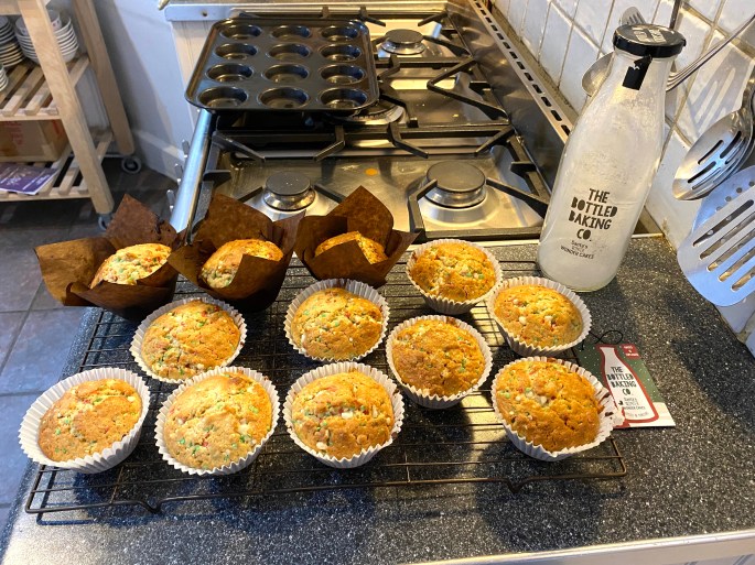 We’ve gone early! It’s still November, but James and I are making Christmas themed cakes already! Santa’s Winter Wonder Cakes from The Bottled Baking Co. They look great, delicious muffins speckled with red, green, and white sugary sparkles.
