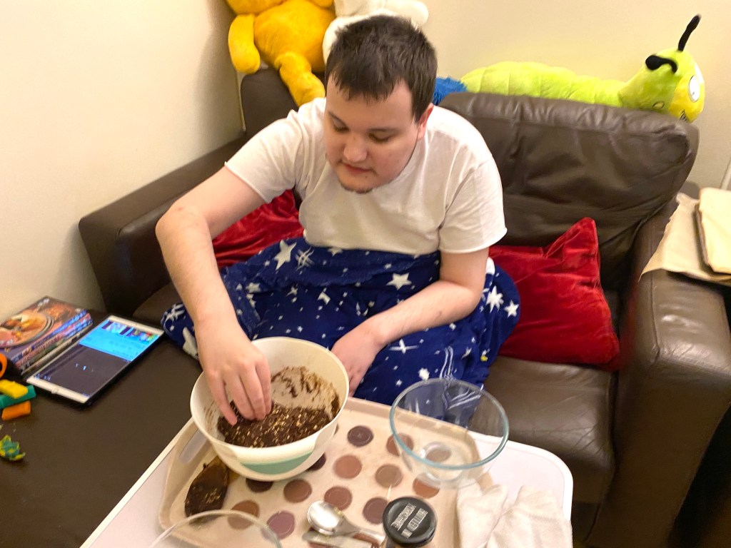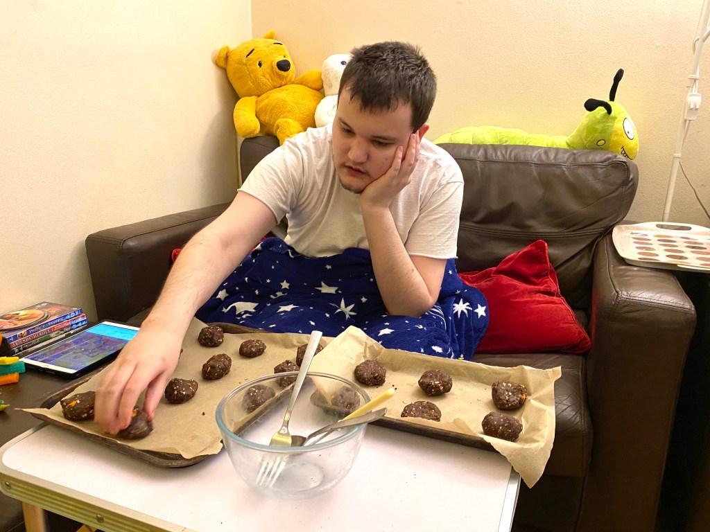 James carefully mixed and stirred all of the ingredients together, and put the dough in a separate bowl, but then had to wait for 20 minutes while the cookie dough chilled in the fridge. That was hard, just as well there was the mixing bowls and wooden mixing spoon to lick clean!