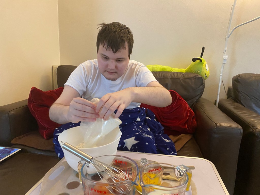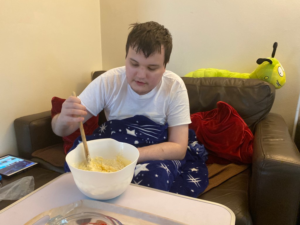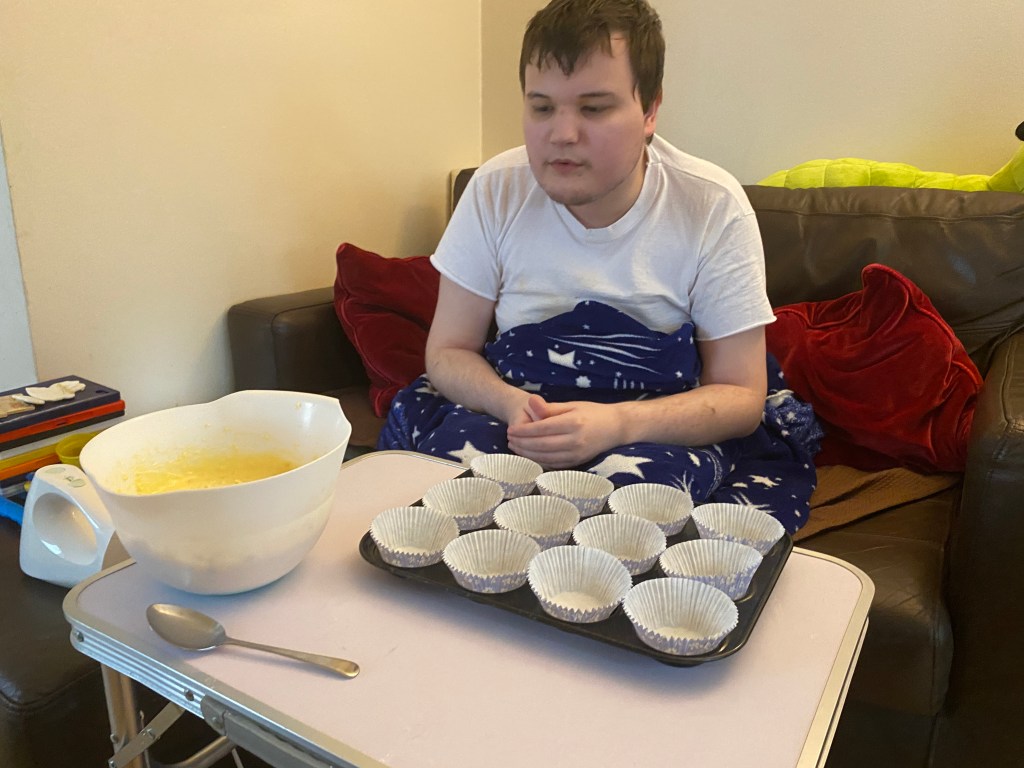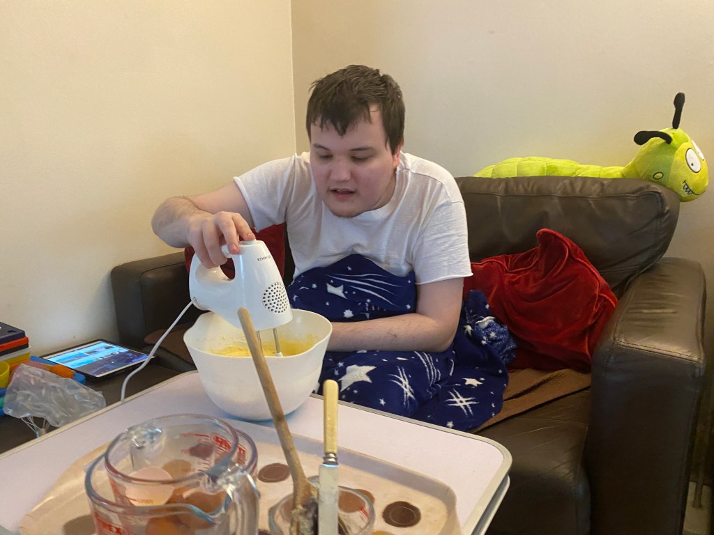 As usual, James carefully added the dry mix into the mixing bowl, followed by the butter, milk, and eggs, before giving everything a thoroughly good stir with the wooden spoon. James then had a go (carefully supervised from nearby!) with the electric whisk! Great job James, the cake mixture is really well mixed and creamy now!