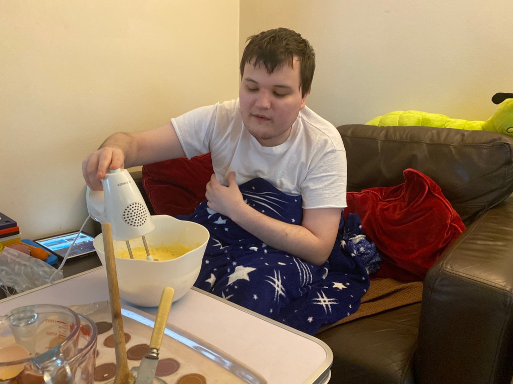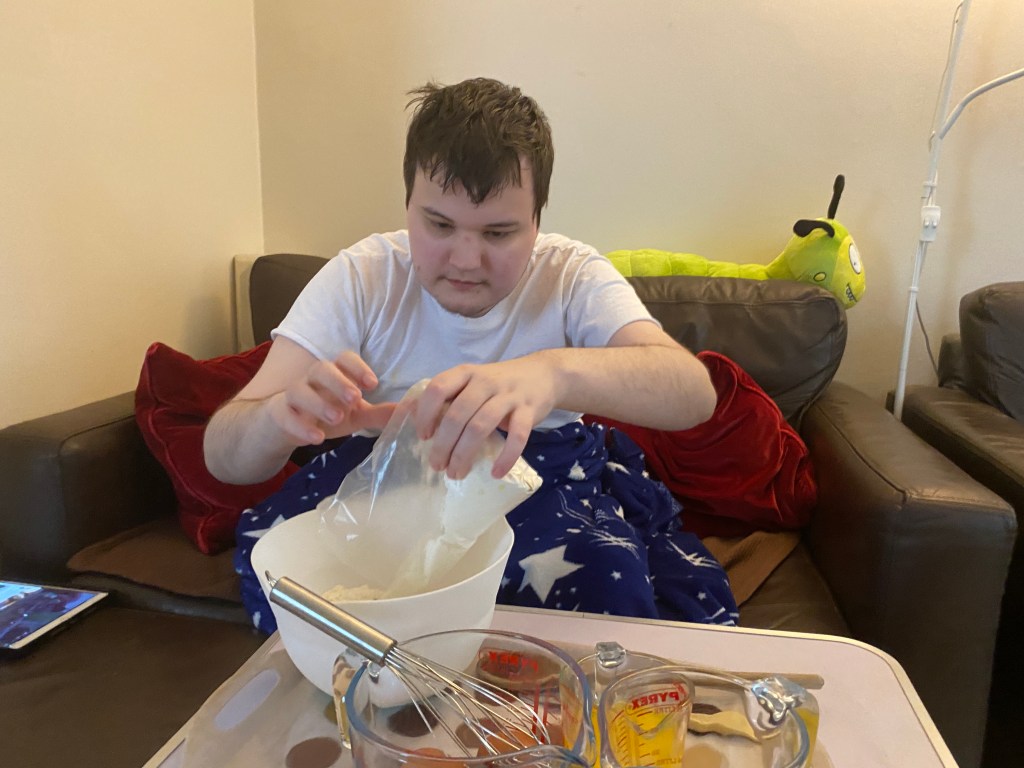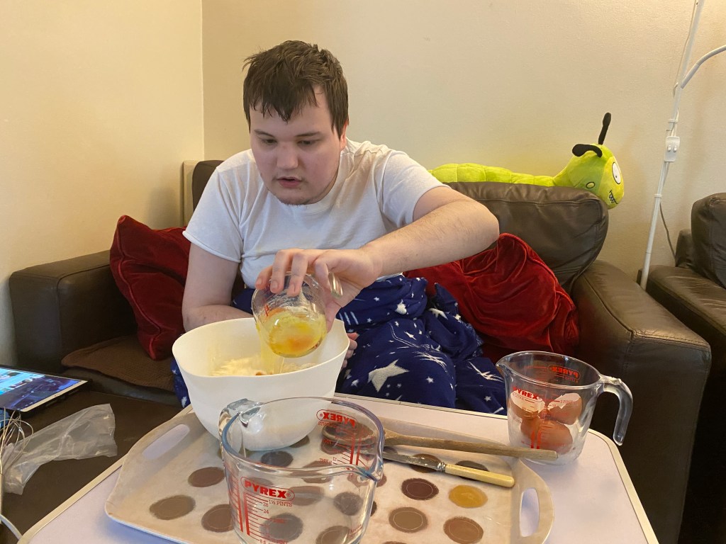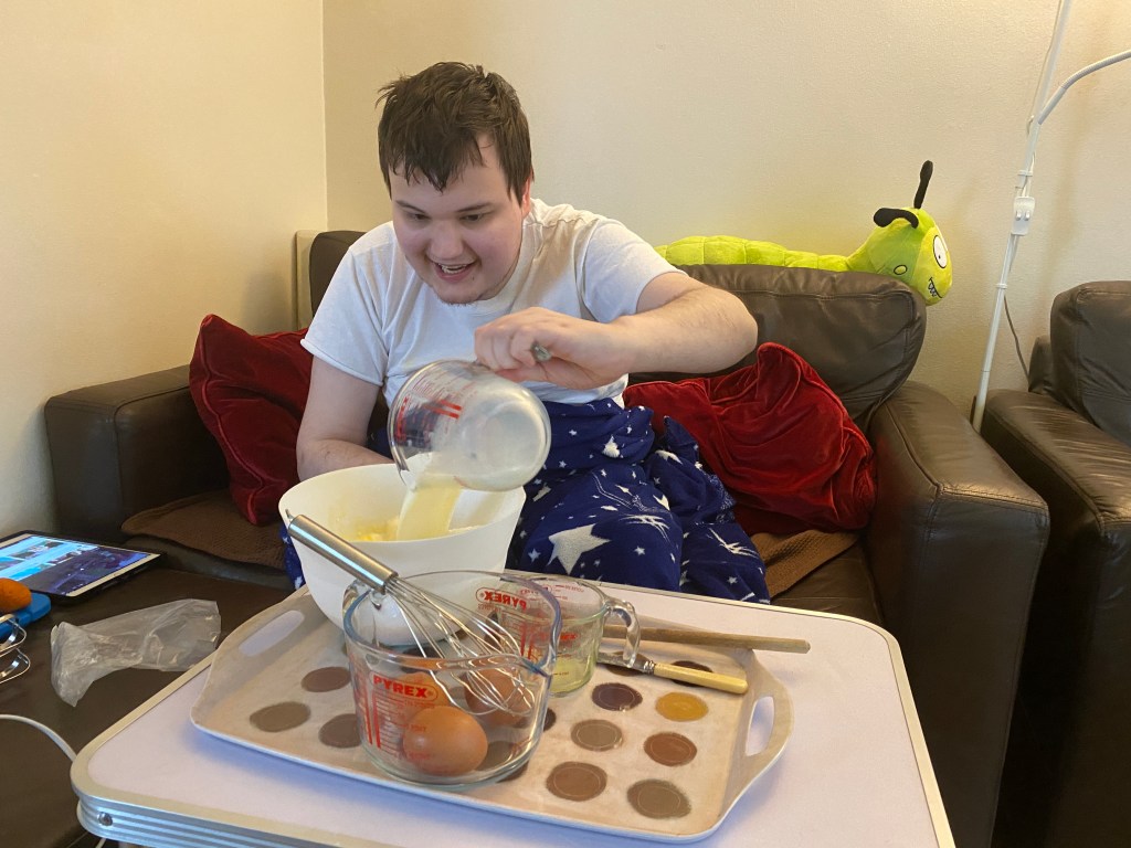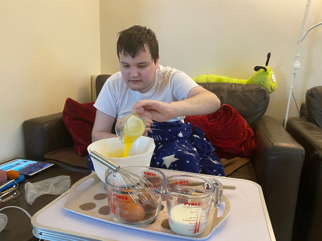 As usual, James carefully added the dry mix into the mixing bowl, followed by the butter, milk, and eggs, before giving everything a thoroughly good stir with the wooden spoon. James then had a go (carefully supervised from nearby!) with the electric whisk! Great job James, the cake mixture is really well mixed and creamy now!
