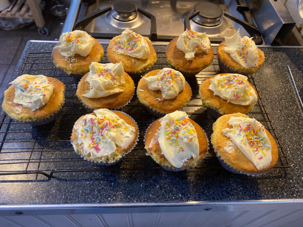 Once they had cooled, we added the buttercream icing and sprinkles! Another bowl for James to lick clean and lots of sprinkles that didn’t stick to the cakes but stuck to James’ tongue!