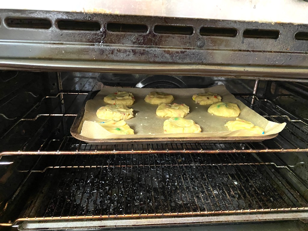 James carefully mixed and stirred all of the ingredients together, including the dry mix, smarties, melted butter, and an egg. He then very carefully helped shaped the cookie balls, pressed each one down with the spoon, and then supervised them going out to the kitchen to go into the oven. Dad put them in the oven, because as James remembers from ‘Big Cook, Little Cook’, the oven is ‘Hot! Hot! Hot!’