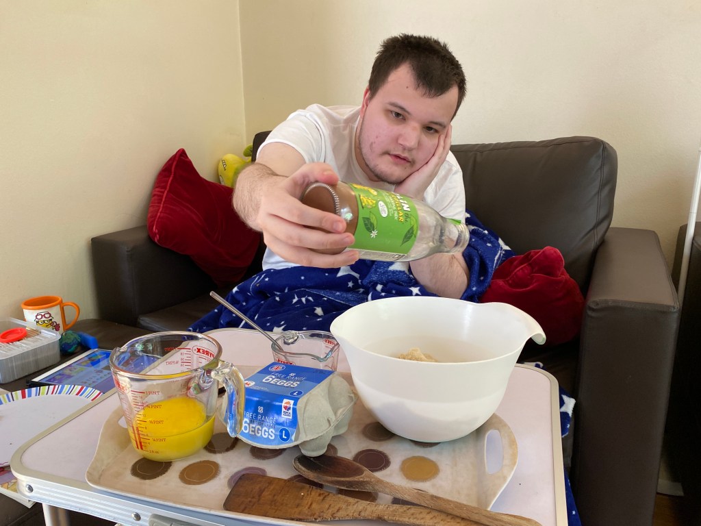 James then added the melted butter and the eggs, making sure that all of these important ingredients made it into the mixing bowl.