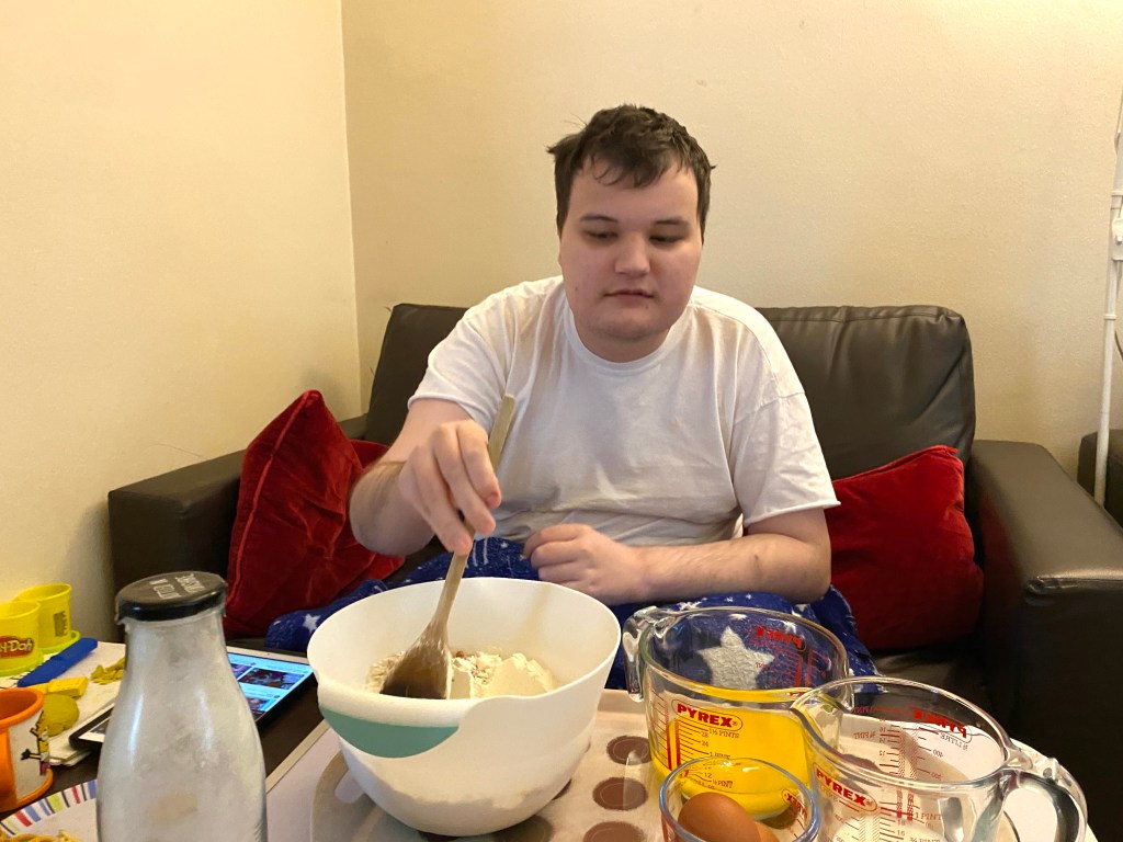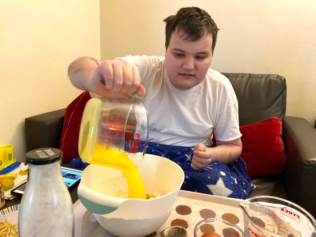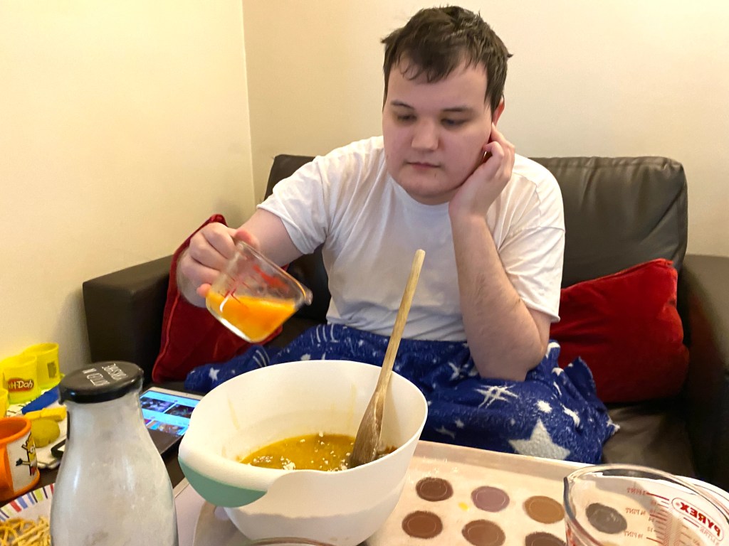 As usual, James carefully added the dry mix into the mixing bowl, followed this time by the melted butter, milk, and two eggs, before giving everything a thoroughly good stir with the wooden spoon.