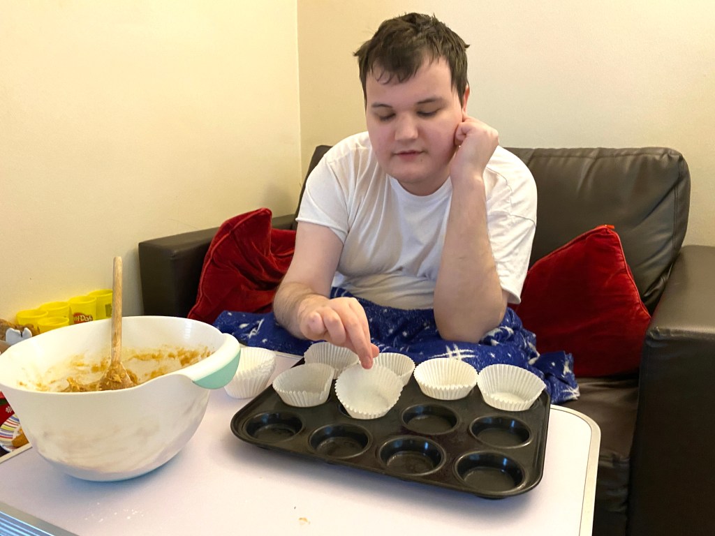 James then carefully placed 12 muffin/cupcake cases on the baking tray, making sure they were all sat properly in their places. James then helped as we spooned out the mixture into the cases.