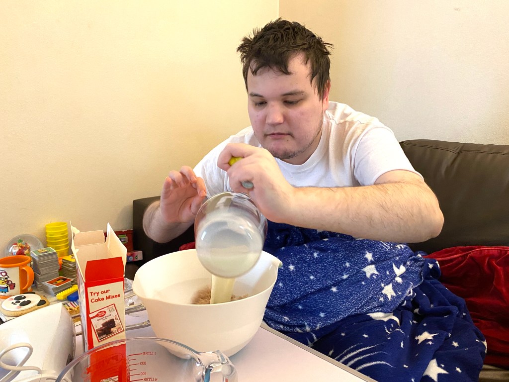 As usual, James carefully added the dry mix into the mixing bowl, followed by the milk, melted butter, and three eggs, before giving everything a thoroughly good stir with the wooden spoon. Then James enjoyed giving everything a good mix with the electric whisk!