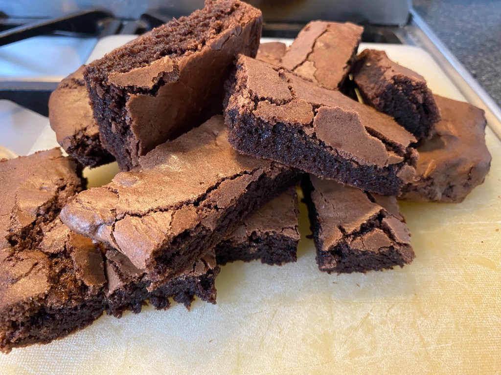 Once they had cooled, we could cut the brownie slab into brownie pieces ready to eat! Another bowl for James to lick clean and lots of chocolatey mixture to get on his t-shirt!