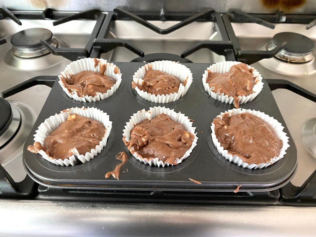 James then placed 6 muffin/cupcake cases on the baking tray, making sure they were all sat properly in their places, we spooned out full-measures and have big muffins!