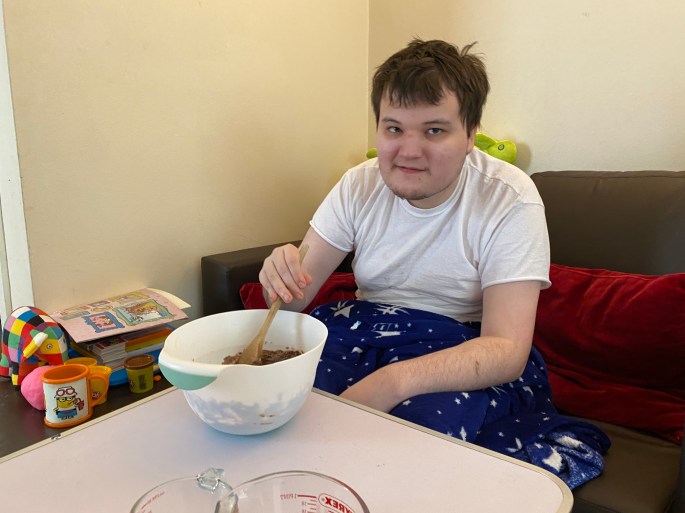 Once they had cooled, we could cut the brownie slab into brownie pieces ready to eat! Another bowl for James to lick clean and lots of chocolatey mixture to get on his t-shirt! (Click above to read more...)
